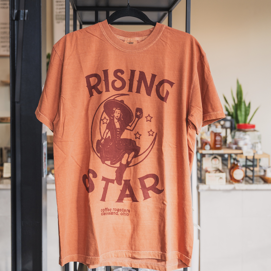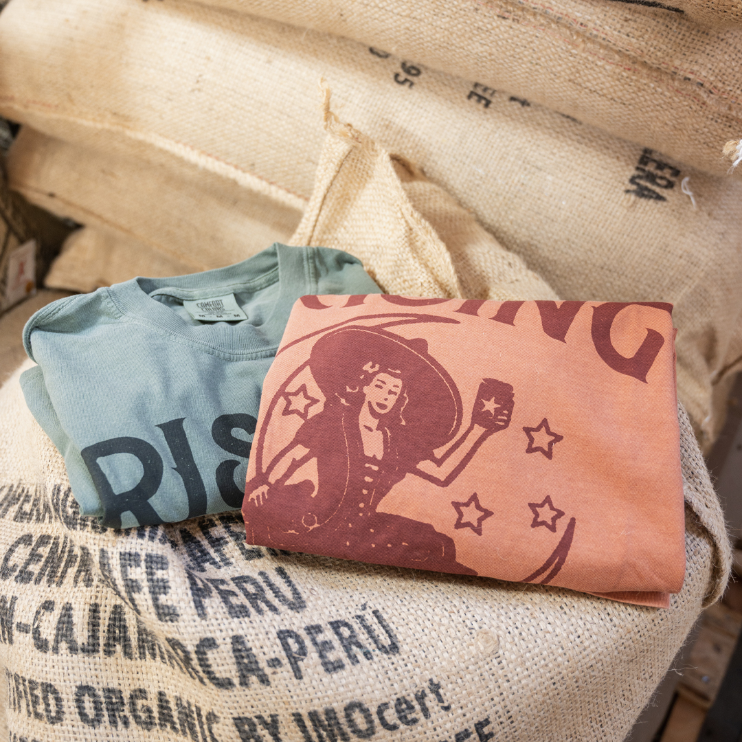 Two tshirts folded and placed on burlap bags. One is orange and features a witch-like figure holding a cup with a star logo. The other is green and has 'RIS' peeking out.